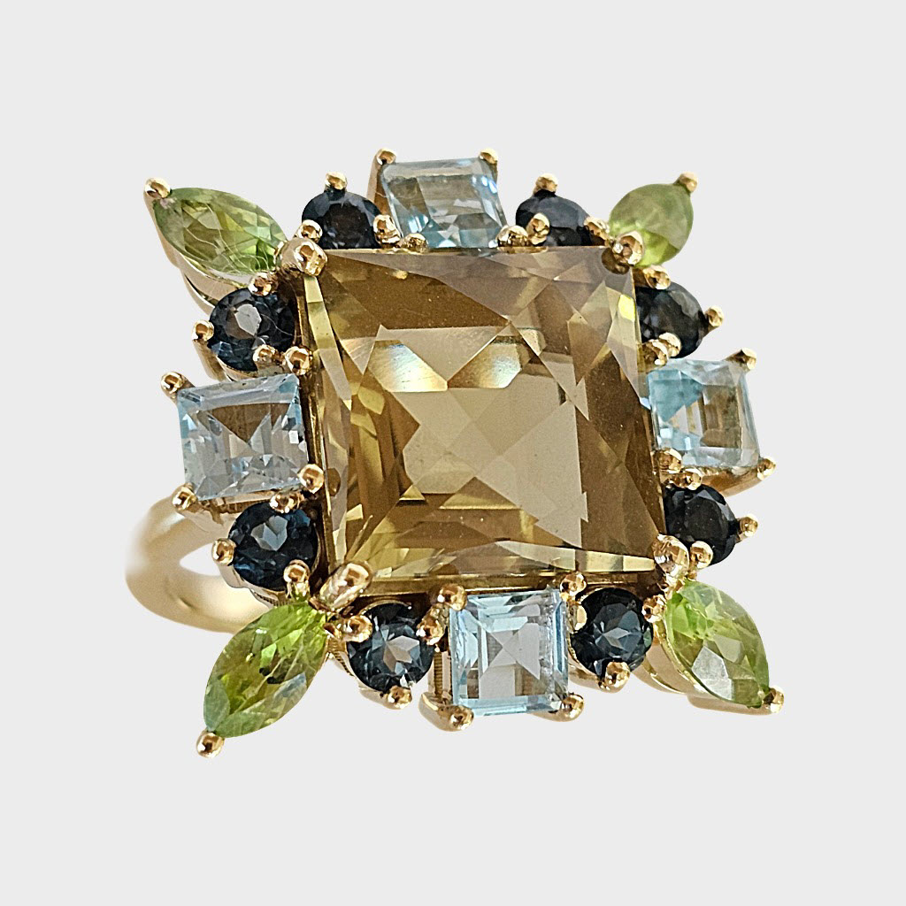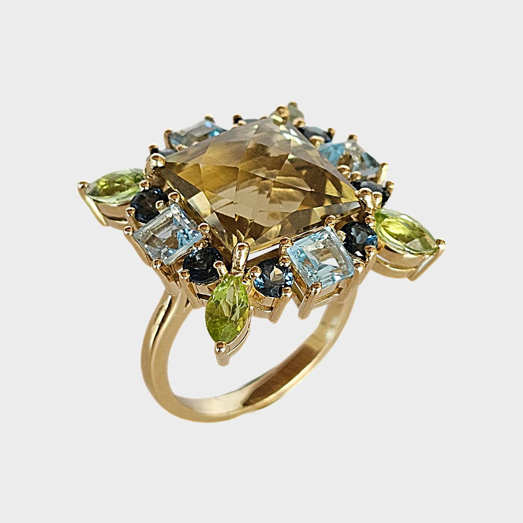 Anel da coleção RM em ouro amarelo 18 k, greengold 7,7ct e topázios 3,03ct e peridotos 1,2ct